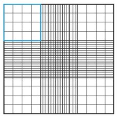 この血球計算盤、名前のとおりで本来は末梢血中の赤血球や白血球の数を数えるためのものなのですが、うちの実験室ではおもに培養細胞の数を数えるのに使っています。そのため、実験室に常時あるんです。今ではバイオセーフティ実験室でも使いやすいように、ディスポーザブルのプラスチック製のものも発売されています。改良ノイバウアー型(図3)で説明しますと、中央の細かい線の部分は赤血球カウント用で、四隅の4×4の四角の部分をした四角の部分が白血球カウント用です。たとえば左上の青線で囲まれた部分、4x4の線で分割されているところは実際には1 mmx1 mmなんです。その中に見える細胞の数を数えるわけです。