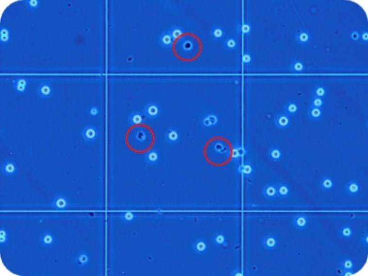 培養細胞を数えるときには、トリパンブルーという染色液を用います。これ、青い液体なんですが、生きた細胞には取り込まれず、死んだ細胞だけが青く染まります(図4)。なので、白く光っている細胞だけを数えることで、「生細胞数」を求めることができるんです。