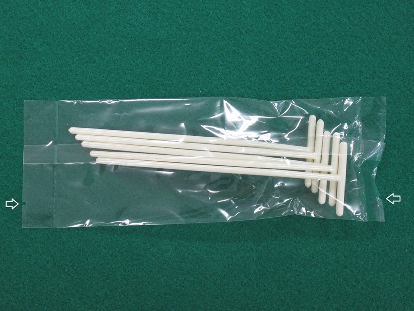 図5は私が塗抹法で使っている、菌液を塗り拡げるためのディスポの「コンラージ棒(コンラッジ棒)」です。プラスチック製でT字型カミソリのような形をしています。これ、昔はガラスをL字型に曲げたやつを滅菌して使い回していたようです。うちの教室にはまだまだたくさん残っていますよ。