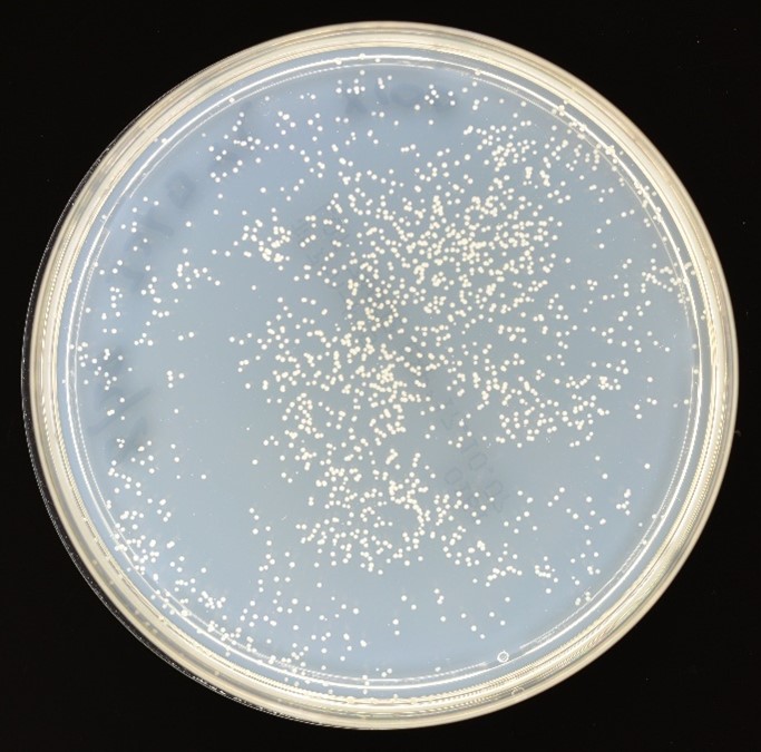 それでは、ご紹介してきた方法で生きている細菌の数を調べてみることとしましょう。試しに黄色ブドウ球菌を塗抹法で培養したら図7のような感じになりました。さあ、まずはコロニーの数を数えましょう!