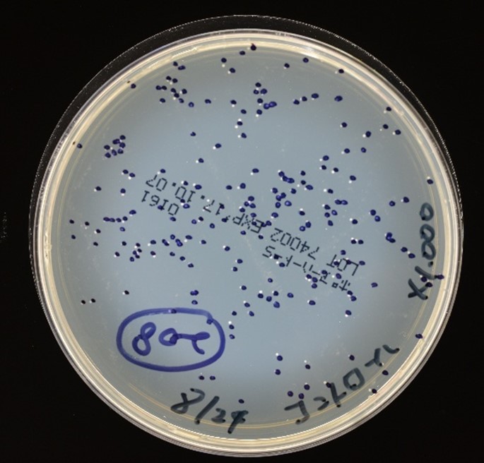 通常、菌液は10倍ずつの希釈系列を作り、その菌液100マイクロリットル(μL)を1枚の寒天培地の表面に塗抹します。1枚あたりだいたい、30個から300個あたりのコロニーができるくらいが最も正確に定量できるといわれており、いくつか塗抹したうち適切な数のコロニーができた平板を「採用」してカウントするわけです。さて、あなただったらどうやって数えますか?