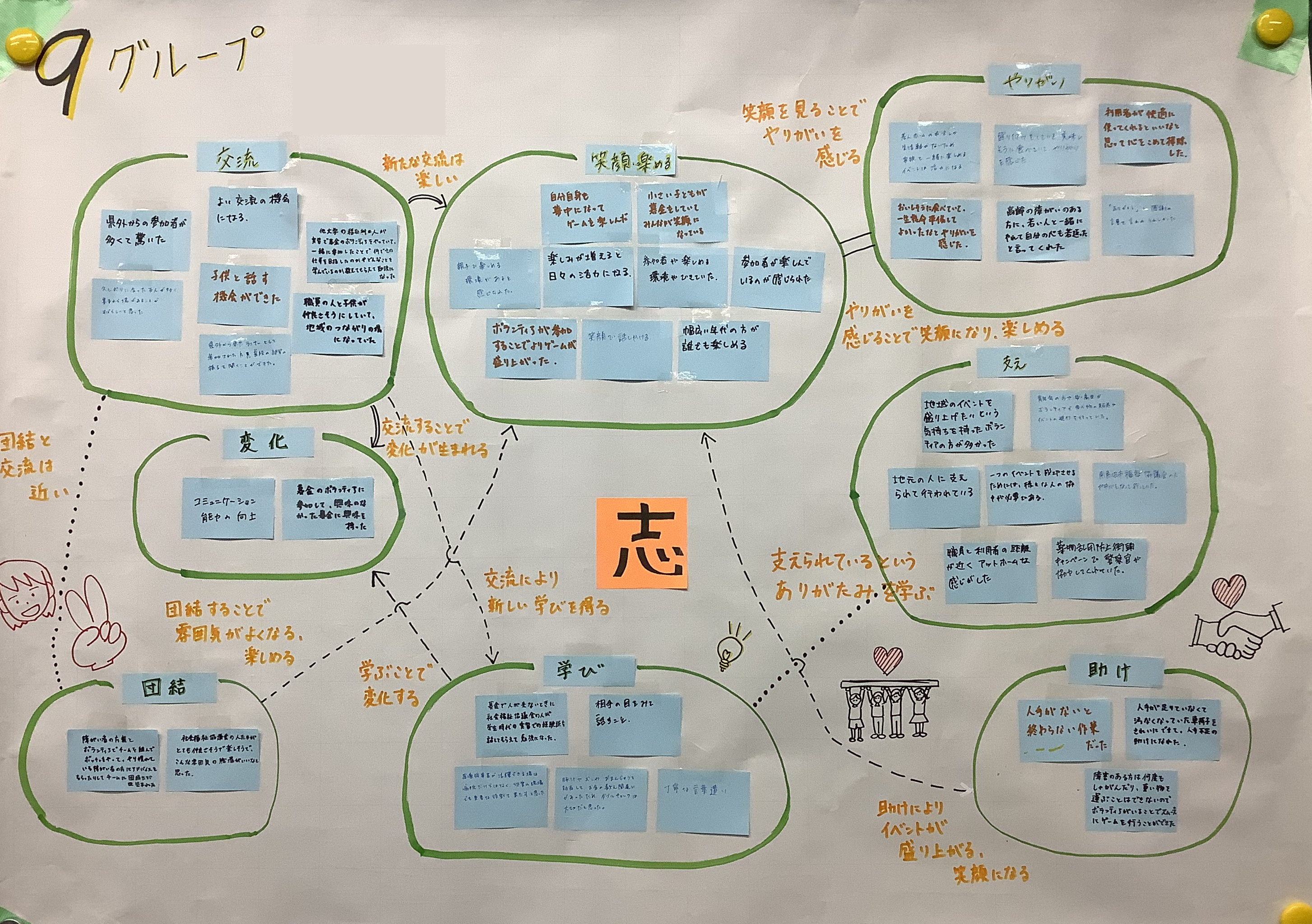 ⑤ 島ごとに見出しをつけ、関係性を考慮して配置し、矢印や線で全体像を完成させる。