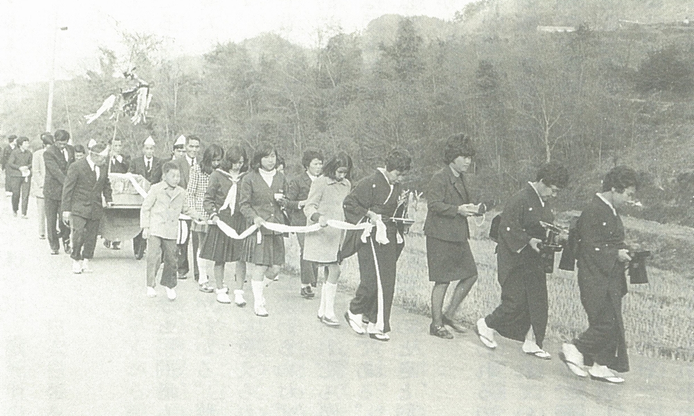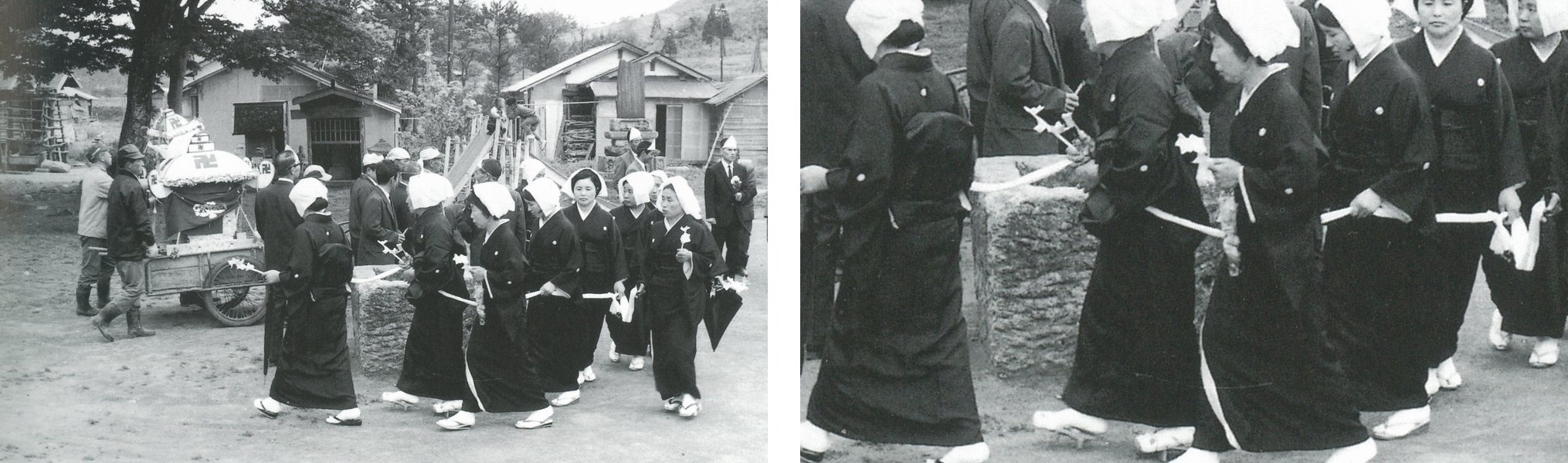 女性たちが白い布を手に握りしめながらゾロゾロと歩いていますね。少しばかり不謹慎ではありますが、ワタクシがこの光景を電車ごっこから連想した理由がお分かりいただけるかと思います。これは善の綱(ぜんのつな)と呼ばれる習俗で、これまでのコラムで何度も登場している野辺送り、つまり葬列で行われることが通例。上の写真は高度成長期真っただ中の1968(昭和43)年に宮城県の七ヶ宿町で行われていた葬列を撮影したものですから、約半世紀ほど前にはなりますが1)、現在でもおとむらいの古式ゆかしい流儀が残っている地域ではちらほらと見かけるものでもあります。縁の綱(えんのつな)や名残の綱(なごりのつな)と呼ぶこともあったり、あるいは善ではなく「禅」の字を当てたりすることもあるのですが、いずれにしても輿や棺などに結びつけた長い白布を葬列に加わった人びとがめいめいに握って故人を送るという点では共通していると言えるでしょう。そしてまた、この善の綱にはもう一つ共通点がありました。それは、ほとんどの場合で善の綱を持つのは女性か、さもなければ子どもであったということ。参考までに別の地域で行われていた善の綱の光景を下に挙げておきますが、やはり女性や子どもが善の綱を持っています。