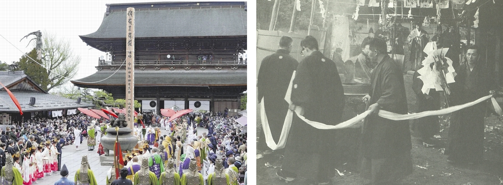 一方、写真の右側にあるのは愛知県の奥三河で行われている花祭り5)という祭礼の光景。これは奥三河の各地で冬に催されるもので、それぞれの地域で独自の特色があるのですが、神楽を奉納した後で祭りが終わりに近づくと、祭場の中央に置いた竈(かまど)の周りを善の綱を持って男性たちがグルグルとまわる「花育て」の儀礼が行われると言います。一説によれば、この儀礼は生まれ変わって再び成長することを象徴的に表したもの6)とされていますから、先ほどの善光寺の御開帳と相通じるような「現世と来世をつなぐ」、そして「生者と死者をつなぐ」というイメージで捉えることもできるでしょう。