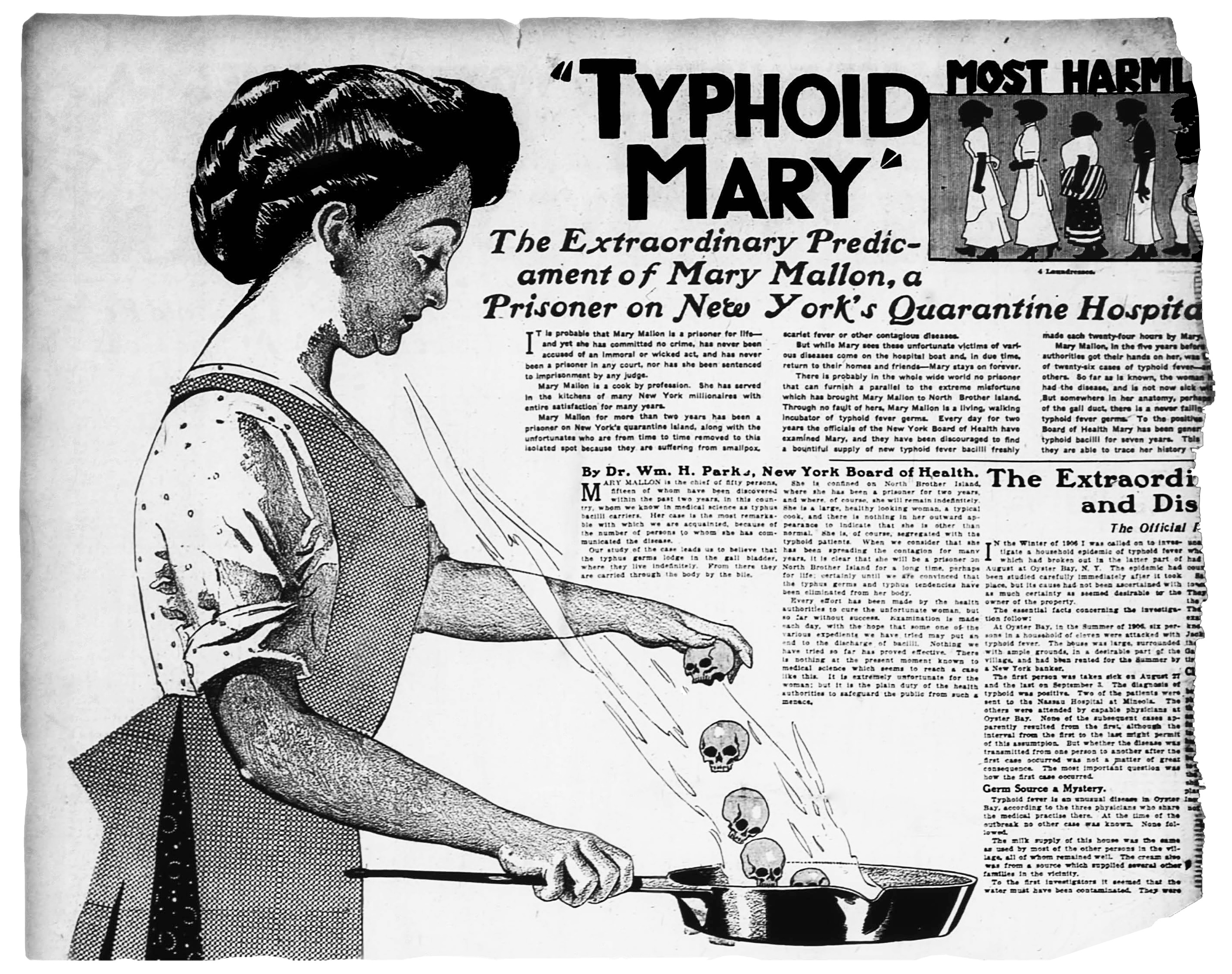 ここで、聡明な読者の皆さんは「じゃあ、どうしてメアリー自身は腸チフスに罹(かか)らなかったの?」と疑問に思ったのでは。そこがまさに悲劇を生みだした大きな理由でもあって、彼女は無症候性キャリア、つまり自らは発症に至らないけれども他人には感染させる可能性のある病原体の宿主2)だったのです。おそらく彼女が最初に腸チフスに感染したときに、抵抗力のほうが勝っていて発症を抑えてしまい、そのまま抗体ができてしまったのだろうと考えられていますが、兎にも角にも彼女は体内に腸チフス菌を抱えていると自覚することもなく、また周囲から患者として意識されることもないまま、次から次へと雇い主の家庭のもとで料理をつくっては、「ゼロ号患者」ないしは「インデックス・ケース」3)として菌をバラ撒いていたというわけです。