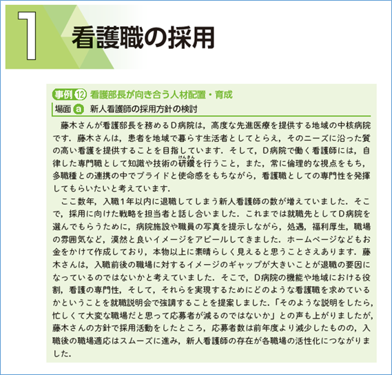佐々木:私も、あくまで創作事例ではありますが、看護部長として実際に経験した内容をベースに執筆しました。新卒採用の戦略や就職説明会、スタッフの勤務体制の変更、職場におけるOJTといった事例(Ⅴ章1-3節 事例タイトル「看護部長が向き合う人材配置・育成」)は、管理者の経験を有する方がご覧になったら「あるある」と思っていただけるのではないでしょうか。