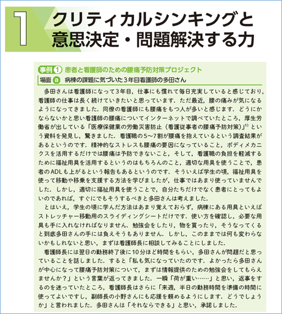 奥: 初めのほうに出てくる、リーダーシップとマネジメントとは何かを伝える事例(Ⅰ章1-2節 事例タイトル「患者と看護師のための腰痛防止プロジェクト」)も同様です。「若手の看護師が自身の腰痛について気になり、患者に合った方法で適切に用具を使うことで、腰痛防止にも患者のADL向上にもつながることを知る。そして病棟で腰痛防止プロジェクトを立ち上げて……」というストーリーです。ひとつの事例の中で、リーダーシップは管理者だけのものではなく、身の周りの困り事から始まるということ、次にそれを解決しようとすることが周りの人のためにもなるということ、そしてケアの質向上にもつながるということ、様々な要素を伝えられるのではないでしょうか。