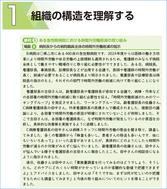 奥:各事例のメインのテーマの背景には、臨床に存在する課題への問いかけも忍んでいます。例えば小玉先生に執筆していただいた時間外労働の事例(Ⅳ章1-2節 事例タイトル「ある急性期病院における時間外労働削減の取り組み」)は、管理者としての時間外労働削減への責務だけでなく、そもそもなぜ削減する必要があるか、という本質も伝えています。