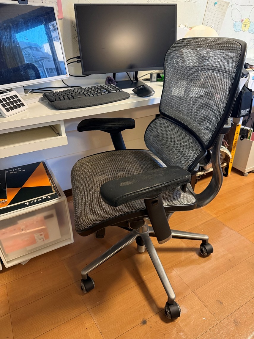 私が大学に異動して真っ先にやったこと。それは、研究室のデスクの椅子を見直すことでした。もちろん、備え付けの椅子はありました。しかし、教員の仕事は想像以上にデスクワークが多く、長時間座り続けることが少なくありません。一方で、腰への負担は集中力や思考の質に直結します。私は自宅では、看護師3年目のときに妻に買ってもらった高機能チェア(図1)を、もう15年以上使い続けています。今でも「最高だな」と思える相棒です。そこで、申請できる研究費を使って、自宅の愛用品とまったく同じ……とは予算の都合でいきませんでしたが、2万円でお釣りがくるくらいの座り心地の良いオフィスチェアを購入しました。これは決して贅沢ではなく、教育や研究という本来業務で最大限のパフォーマンスを発揮するための、必要な環境調整だと考えています。