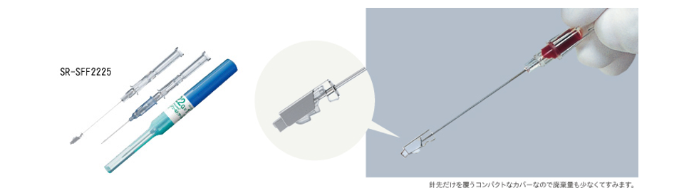 さて、私も所属している感染対策室では針刺し事故対策もやっていますが、最近は「針刺し事故防止装置付き」の注射針というのも出てきました。私が若いころ、針刺しをやっちゃったときは「翼状針(翼付静注針、翼静針とも)」と、静脈留置針の「内針」が原因でした。最近はどちらも使用後に針が引っ込んだり、針先にカバーが自動的についたりする機構が搭載されています。静脈留置針は、外筒と内針からできているもので、外筒は柔らかい素材でできていて、これだけを静脈に留置することで安全に持続点滴ができるようになっているんですが、柔らかいと刺せないので金属製の内針といっしょになっていて、静脈に入ったあと内針だけを抜き取るようになってるんです。図4はテルモ社の「シュアシールド サーフローⅡ」っていう静脈留置針ですが、この「抜いた内針」をすぐに針捨てボックスに入れないと、私のように針刺し事故を起こしてしまうんです。写真で分かるように、この製品では内針を抜くと針先にカバーが自動的に付くようになっています。他社製品ではボタンを押すと引っ込むようなものもあります。