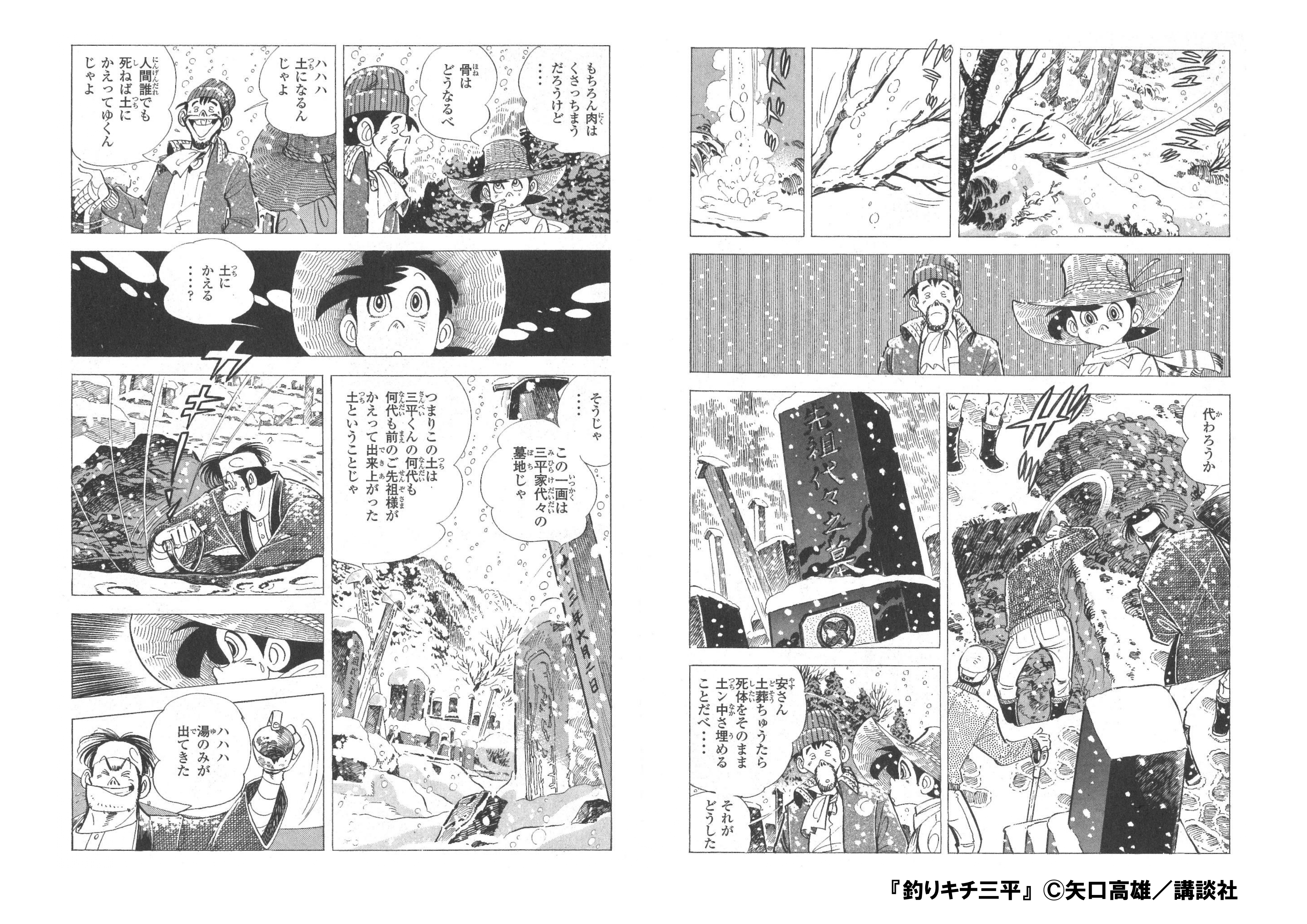 火葬率、すなわち火葬された死亡者が総死亡者数に占める割合は、日本が近代国家への道程を歩み始めた明治時代中期の1896(明治29)年で26.8%、第二次世界大戦を経て高度成長期に入ろうとする時点の1955(昭和30)年でも54.0%と半数程度で、矢口先生の幼少期にはまだ土葬も珍しくありませんでした。『釣りキチ三平』連載中の1980(昭和55)年では91.1%にまで上昇していますが、それでも約10人に1人はまだ土葬。とは言え、近年は100%をわずかに下回るという水準が長らく続いており、土葬の経験と記憶が社会全体からすでに消え去りつつあります。そのような状況のなかで、『釣りキチ三平』に描かれている土葬の風景は、その様相や機微を驚くほど緻密に「マンガという世界を通じて経験させてくれている」という点でも非常に意義深いのです。