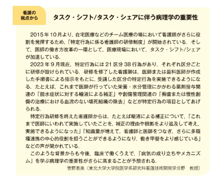 - 看護教員をはじめ各分野の専門家が執筆したコラム(「看護の視点から」「トピックス」)を通し、病理学の知識が臨床現場にどう活きるかを知ることができます。